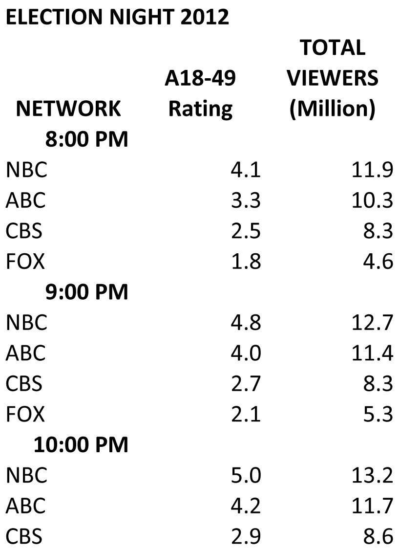 Above are the overnight ratings for the “big 4” networks for election coverage last night. NBC is the clear winner. So, who do you think was watching the networks, in terms of their demographics and psychographics–especially their political leanings?