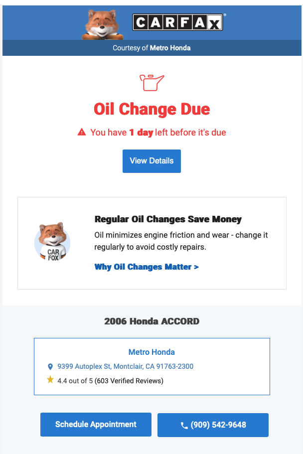 Later, I got a notice that I was due for an oil change. This was in August. That seemed odd to me, since I had just gotten one not long ago. I did a little clicking on links and discovered that this was based on my last oil change done by my nearby Honda dealer, Metro Honda. They had indeed done an oil changrs and based on their estimate of how long oil changes last, I could see how it would seem that I was due for another. I decided I wanted CARFAX to get the full story about my car and I filed a request for them to review the work done on my car by non-Honda dealer mechanics. I sent photocopies of the invoices for the non-Honda dealer work that had been done on the car.