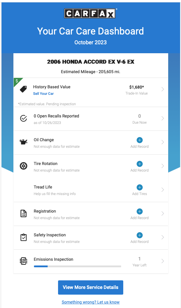 On October 27, 2023, I got an email alert from CARFAX about my 2006 Honda Accord EX V-6 that showed what it knew and did not know about my car, with an estimated value of $1680.